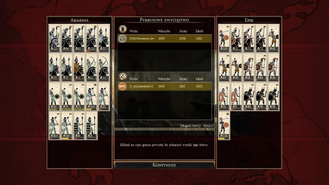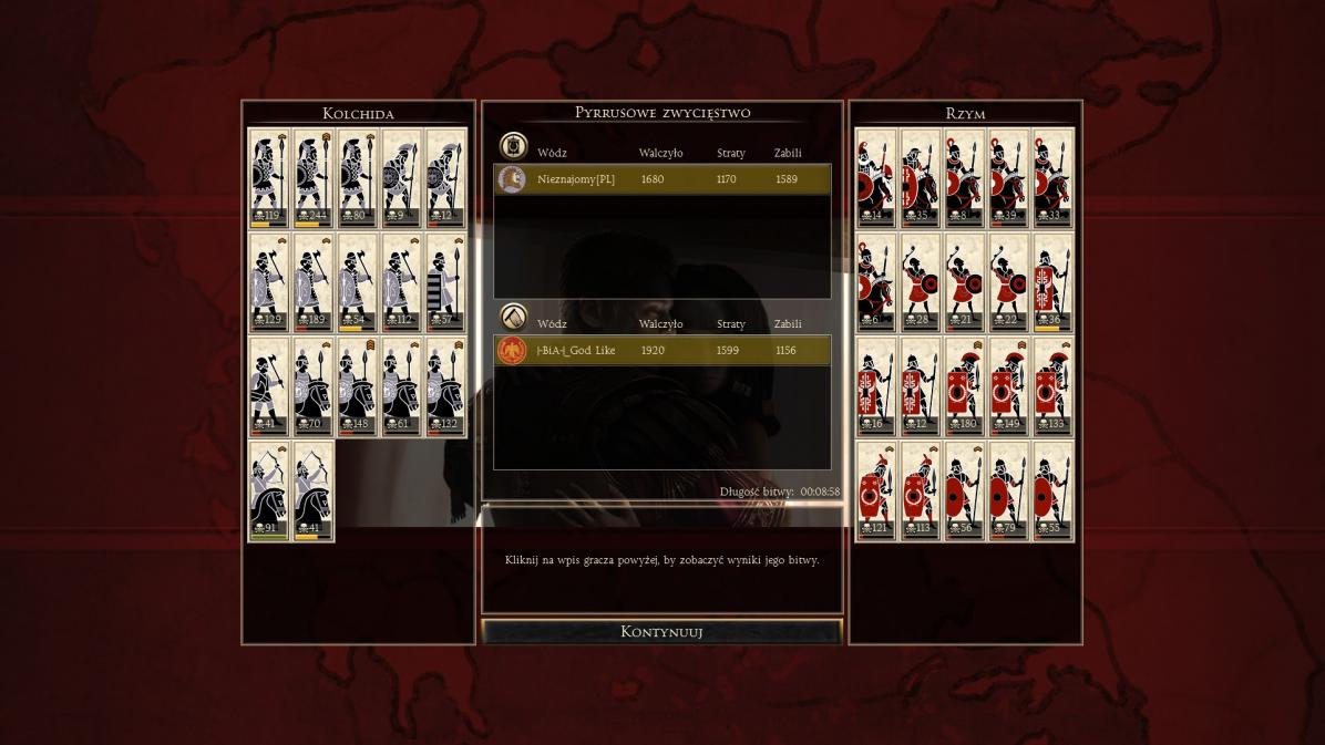2 Zapki, 3 wybrane miecze, 2 szlachetni włócznicy, reszta gorsze włócznie, 3 proce, 3-4 ciężkie jazdy, genek w szlachetnej jeździe. Zniszczyłem go piechotą. Plus mocno ostrzelałem ha. Mam powtórkę jakby co. Każdą bitwę zapisuję, przyda się nam w kolejnych rundach. Zapisujcie powtórki.