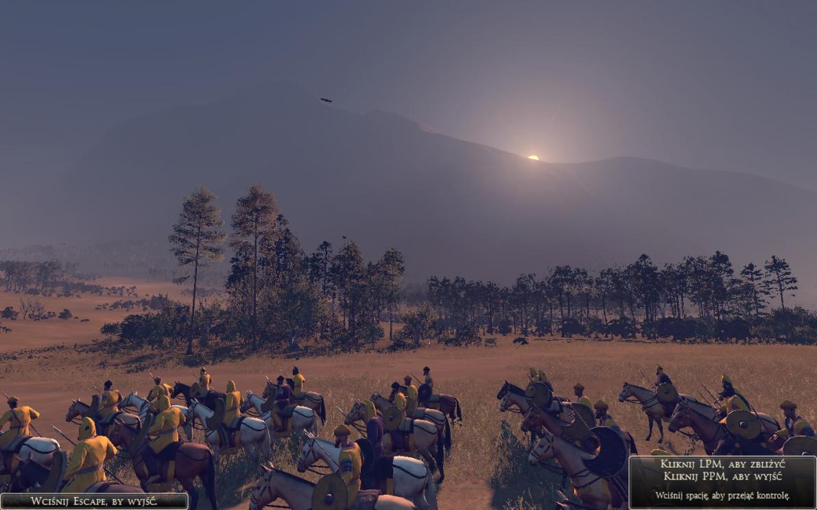 Powyżej piękno Gór Kaukazu przy zachodzącym słońcu widziane przez zwiadowczy oddział lekkiej kawalerii Pontu maszerujący przed głównymi siłami.