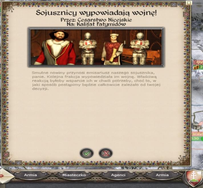 Nie miałem żadnej wiedzy o tych lekkomyślnych działaniach mojego wasala. Zresztą jeśli chcesz to możemy podpisać pokój i nakażę wasalowi też podpisać pokój (chyba mam prawo mu rozkazać?). Ale jeśli nie, to niestety muszę podtrzymać decyzję o zerwaniu sojuszu, by wspomóc wasala. Nie zostawimy go samemu sobie. Naprawdę myślałeś, że zajmiesz sobie jego ziemie bez interwencji seniora w jego obronie?
