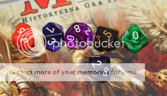 Pierwsze rzuty za husarię, 7 kości, husaria bazowo ma wyszkolenie 5 ale dodajemy +2 za impet z szarży i +1 za pistolety-8 lub mniej.