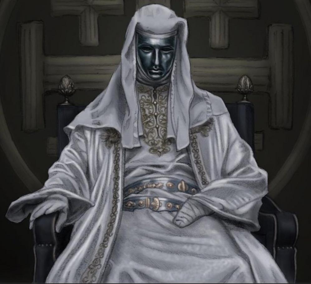 Do namiotu Charlona przybywa dostojnie ubrany w szaty koloru piaskowego i żółtego osobnik. Ubrania ściśle owinięte były wokół ciała, jedynie peleryna z licznymi starożytnymi inskrypcjami powiewała swobodnie. Na twarzy podobnie jak de Vauru miał maskę, ta jednak wykonana była z brązu i przedstawiała obojętny wyraz twarzy. Dziury na oczy jednak zupełnie nie komponowały się z maską gdyż świeciły one wręcz odbitym światłem, dając dziwne uczucie niepokoju. Posłaniec ukłonił się przed Charlonem i rzekł: